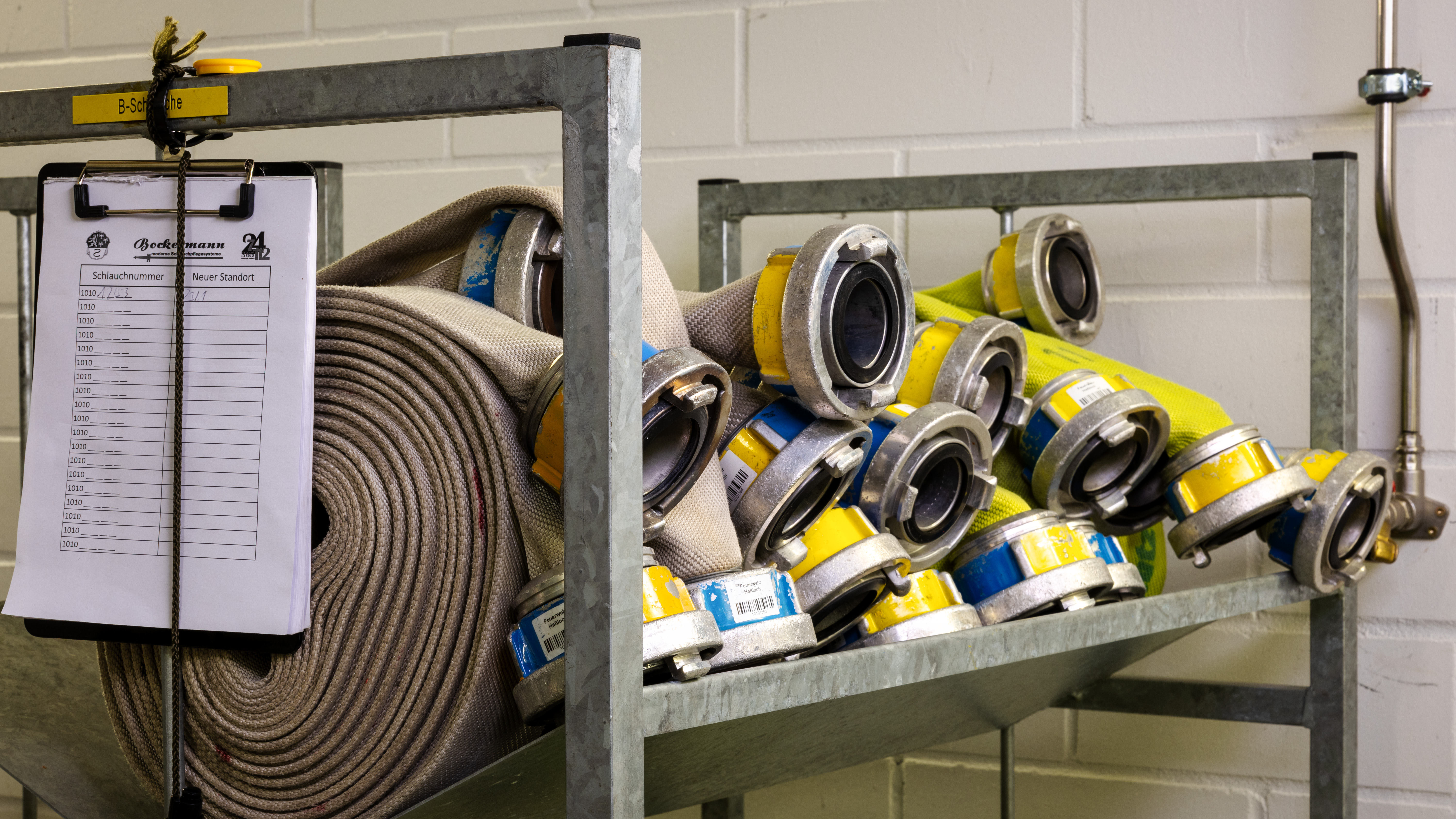 Um nach Brandeinsätzen die Fahrzeuge wieder aufrüsten zu können, werden in der Schlauchwerkstatt in mobilen Regalen eine größere Anzahl an Schläuchen aller Größen vorgehalten, sodass die Fahrzeuge direkt wieder einsatzbereit sind. Auch wasserführende Armaturen sind zum schnellen Austausch vorhanden.