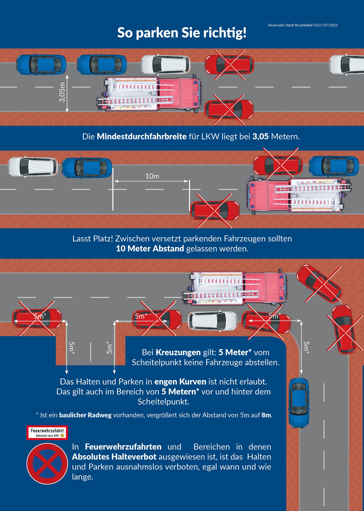 Auch im ruhenden Verkehr können Sie zum Hindernis für Rettungskräfte werden. Danke an die Feuerwehr Bruchköbel, die uns den folgenden Flyer zur Verfügung gestellt hat. Hier können Sie sehen, wie Ihr geparktes Fahrzeug zum Hindernis wird und wie Sie Platz lassen für die Einsatzfahrzeuge.